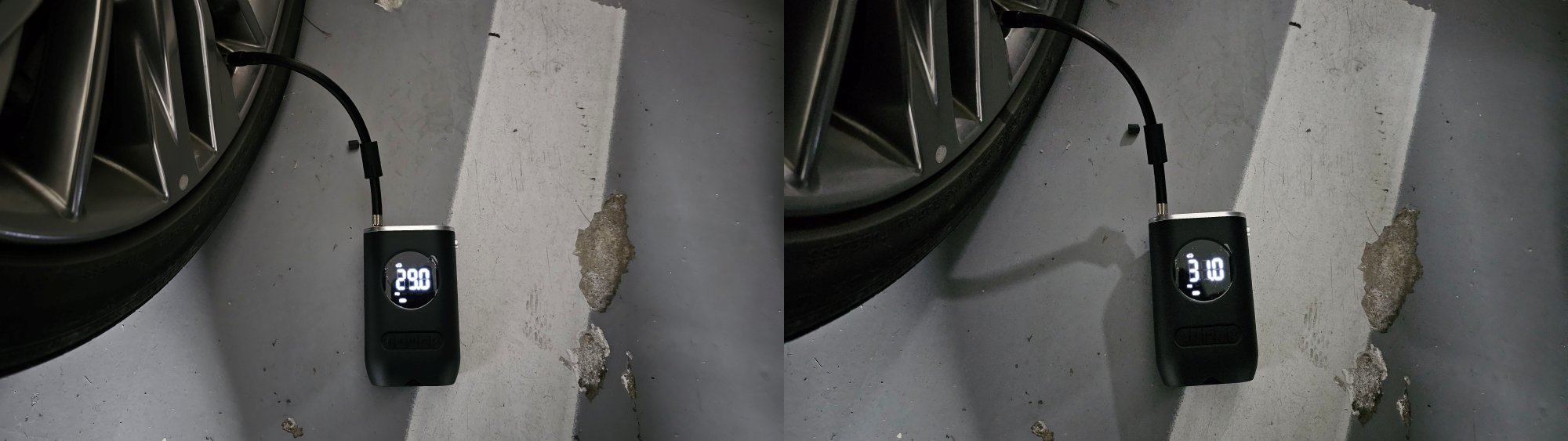 이제 사용방법을 알아봤으니 차로 이동해서 공기를 주입헤볼차례다. 타이어 마개를 열고 주입기를 돌려서 꼽고 작동버튼을 누르면 된다.