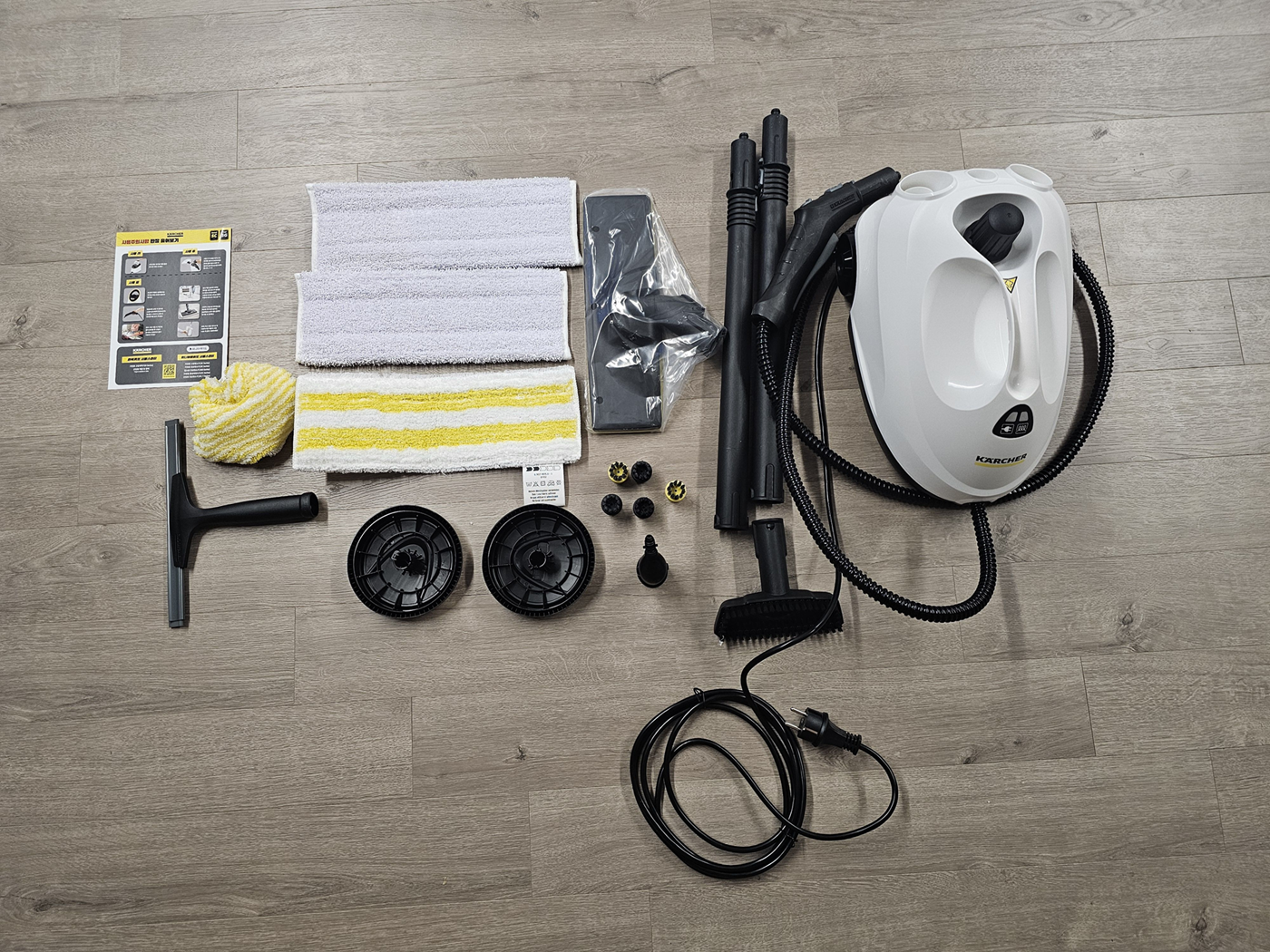 본체, 스팀호스 및 건, 각종 노즐브러시, 연장봉 2개, 극세사천등이다. 무선이 아니라 유선이지만 줄길이가 길어서 웬만한 곳에서는 사용이 가능할 것 같다.