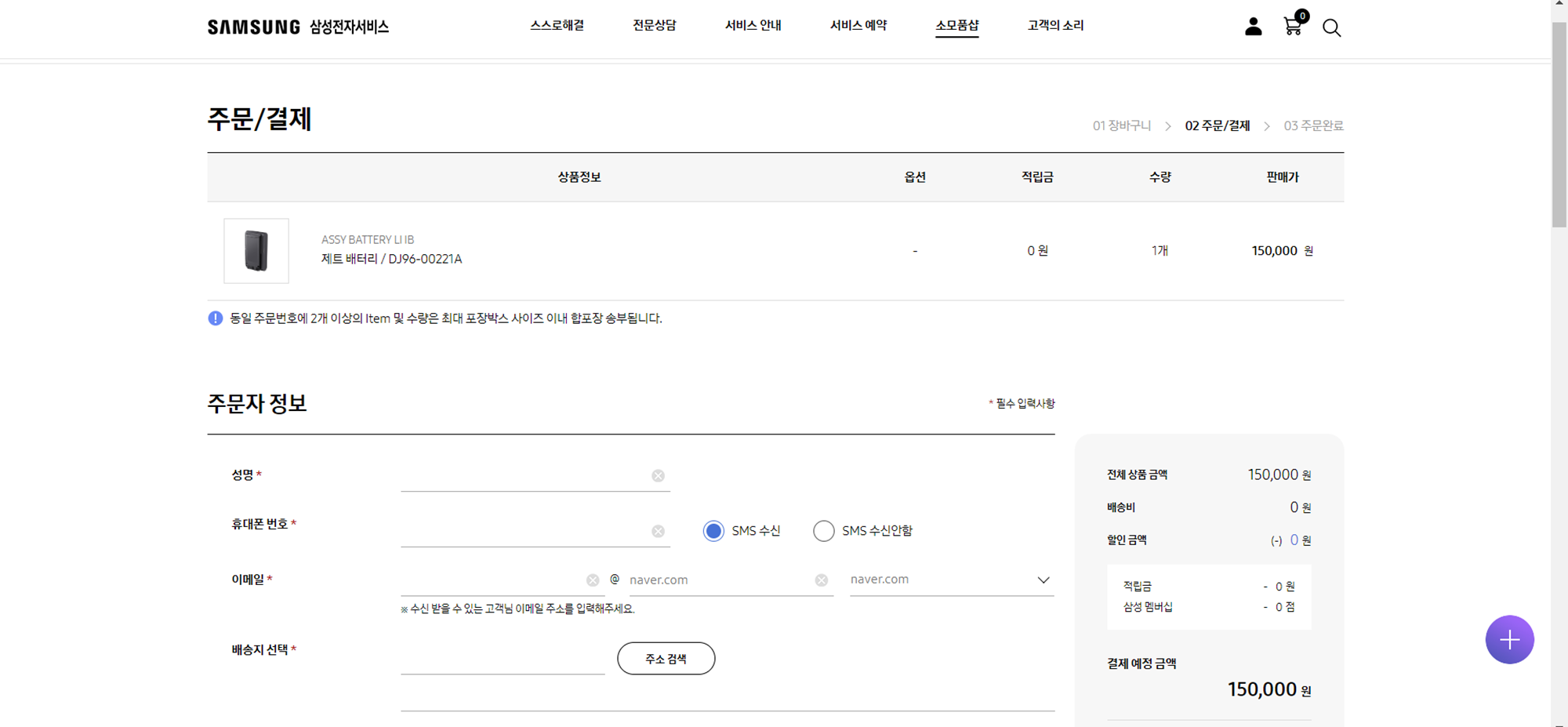 검색된 상품 중 배터리를 선택하면 구매창이 나오며, 구매하기 버튼을 클릭하고 배송지 정보를 입력한후 결재를 진행하면 된다.