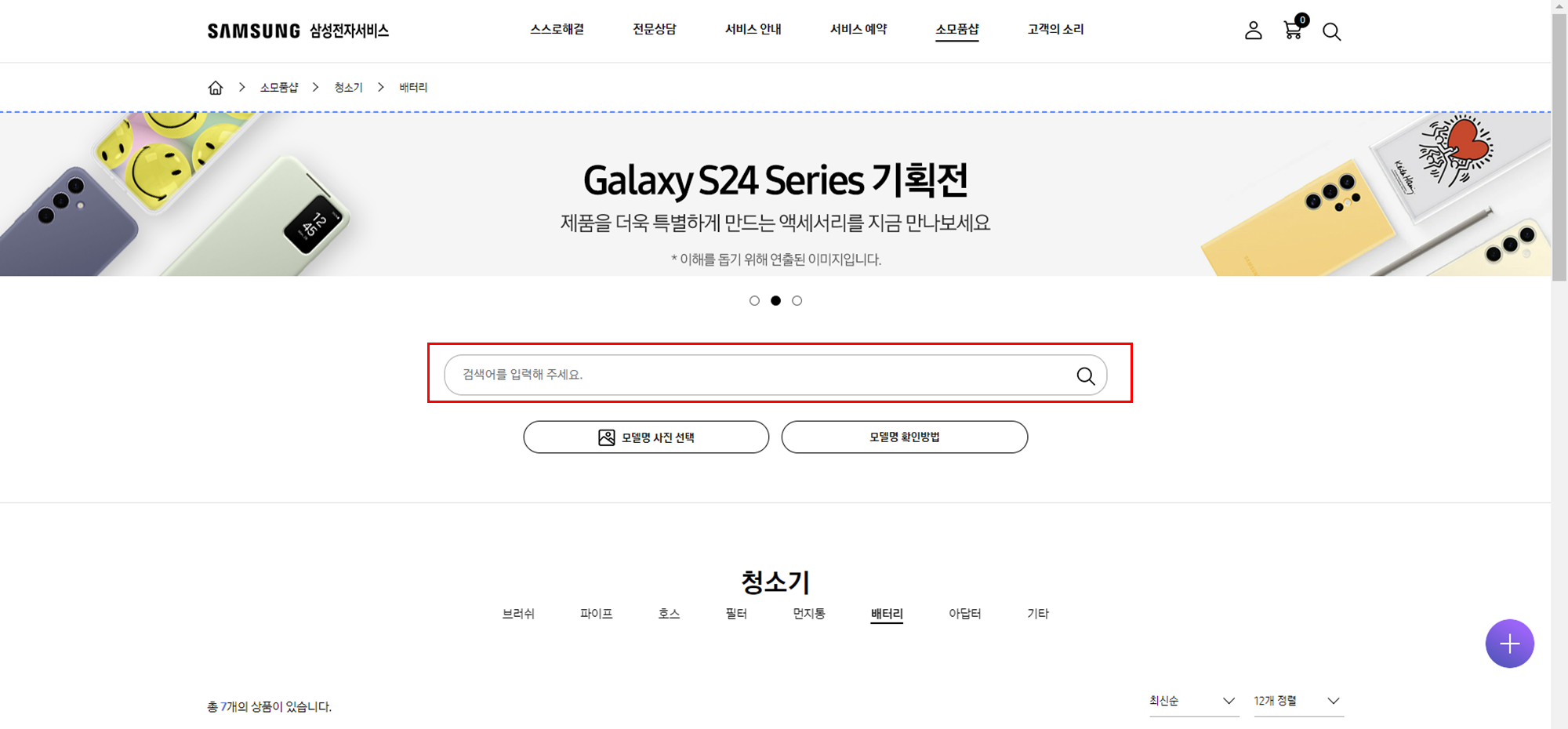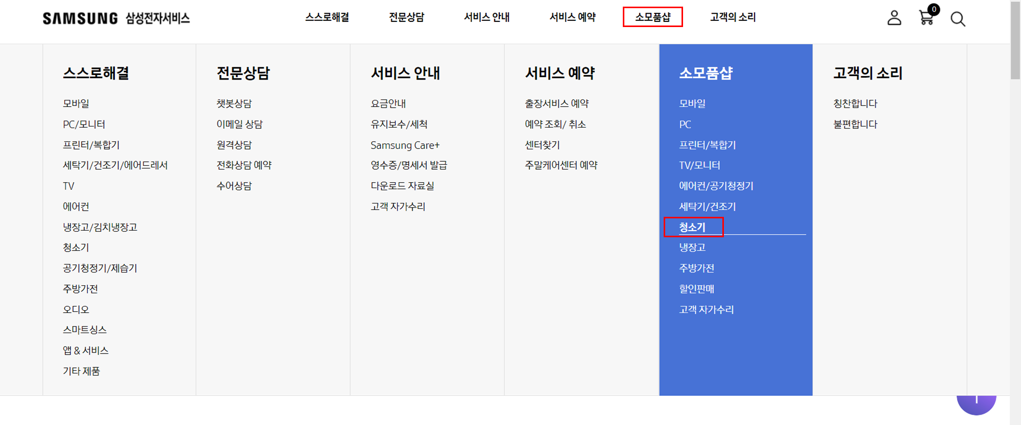 홈페이지 상단에 소모품샵에서 청소기 카테고리를 선택한다.